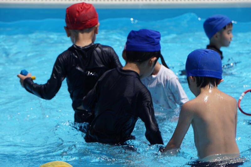 その後は、場所をプールにうつしての交流です。ペアになり、宝探しなどをして楽しみました。