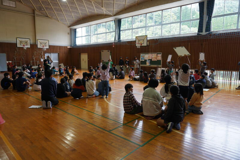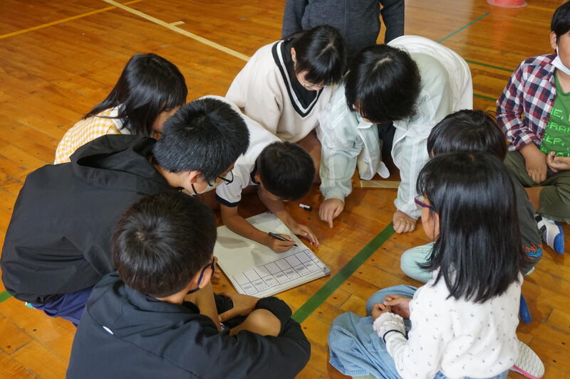 縦割り班ごとに、低、中、高学年向けのクイズに答えます。