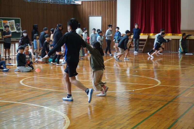 その後の時間は、縦割り班毎にゲームです。2人組のペアになって、手のひらでボールを押し合い、落とさないようにしてリレーをしました。