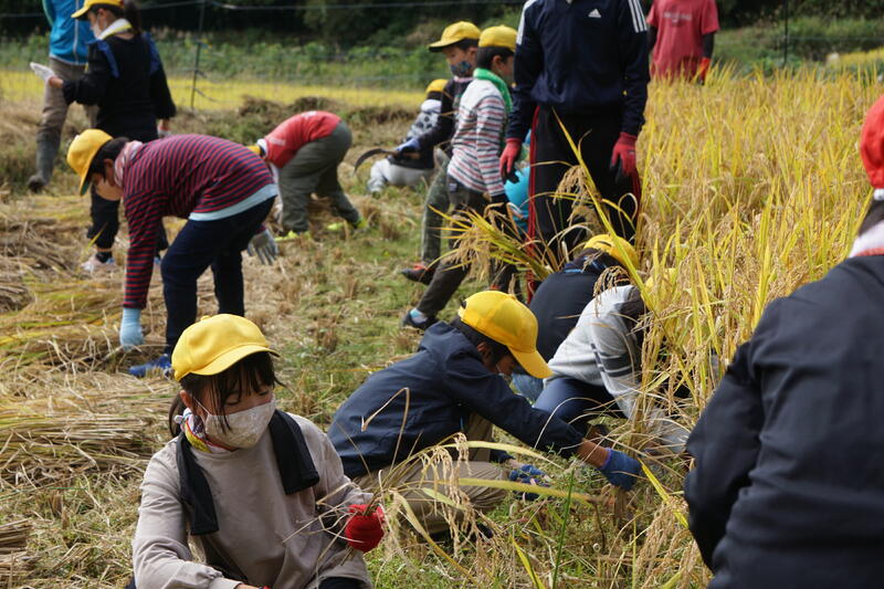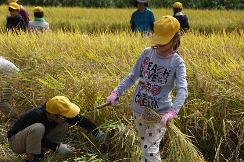 PTA環境保体部長さんより、鎌の使い方を教わり、いざ、稲刈りへをはじめた子どもたち・・・最初はこわごわ刈っていましたが、だんだん鎌の使い方も慣れてきて、稲を刈るスピードもあがってきました。