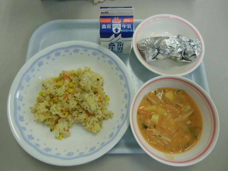 *今日は図書室と給食室のコラボ給食でした。「ぎょうれつのできるすうぷやさん」という絵本に、ジャガイモとトマトの入ったスープがでてきます。それをイメージして作られたそうです。給食時間にはその絵本の読み聞かせもありました。どんなお話だったかな?