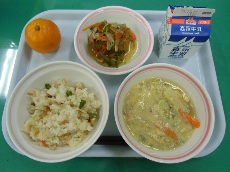 里芋ごはん、厚揚げの野菜あんかけ、かきたま汁、みかん