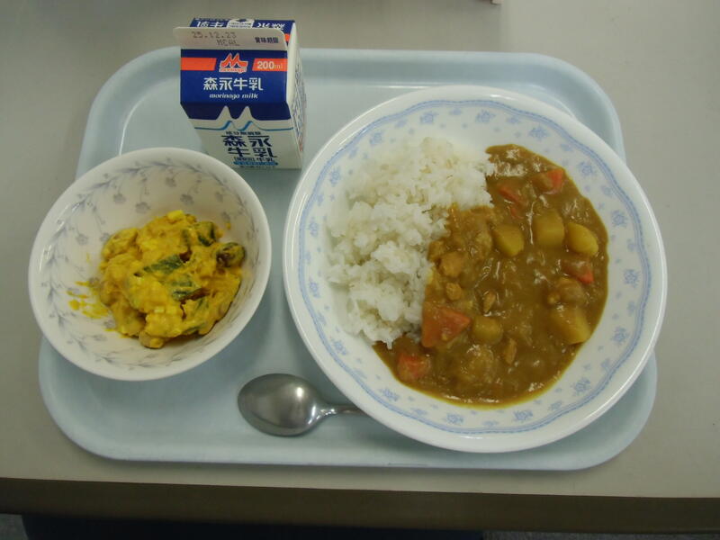 *今日は、みんなに人気のカレーでした。豆とカボチャのサラダも、食べ応えがあり、かぼちゃの甘みもあって、おいしかったです。