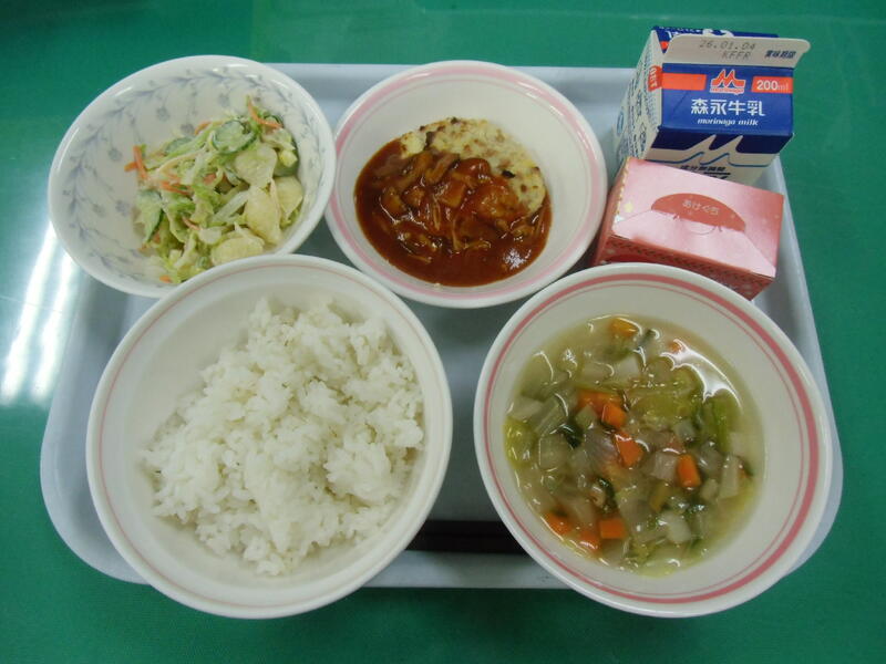 麦ごはん、豆腐ハンバーグデミソース、野菜スープ、ミックスサラダ、セレクトケーキ