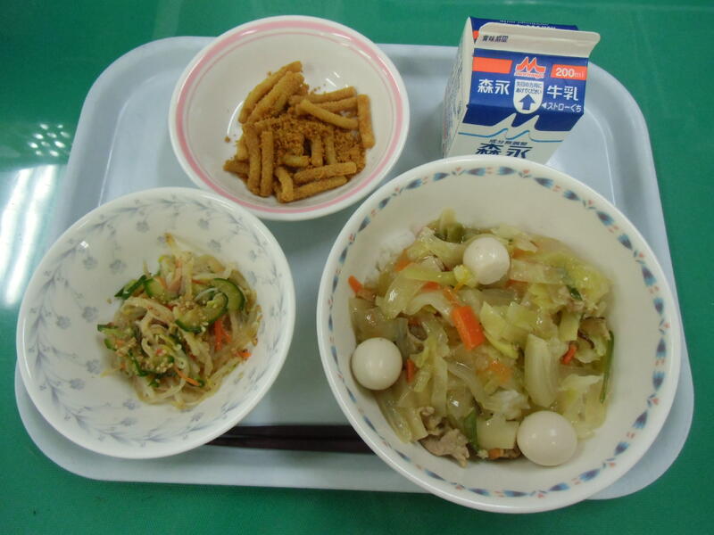 12月10日(水)今日の給食 投稿日時 : 13:57 学校サイト管理者 中華丼、きゅうりともやしの酢の物、マカロニのあべかわ *今日の中華丼は、白菜ではなく、キャベツが使われていました。他にもいろいろな野菜がいっぱい入っていて、おいしい中華丼でした。