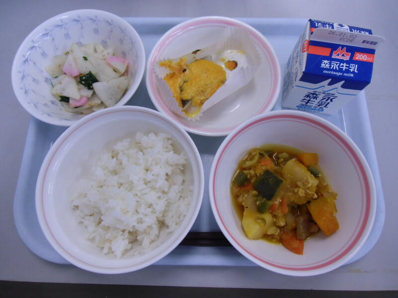 麦ごはん、魚のこがね焼き、かぼちゃのそぼろ煮、かぶのゆず風味あえ