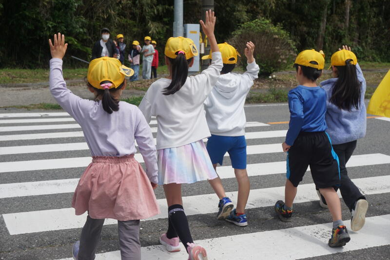 子ども達は、目の前を結構なスピードで通り過ぎる車にちょっとドキドキしていた様子でしたが、ちゃんと教えられた通り、周りをみて、手を挙げて(通りますよとアピールしながら)はや足で渡っていました。もちろん、お礼の挨拶もわすれませんでした。
