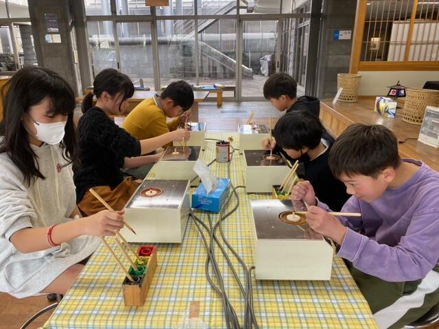お昼からは二つ目の見学場所の熊本市工芸会館へ移動し、工芸品の見学と肥後コマの色付け体験をしました。