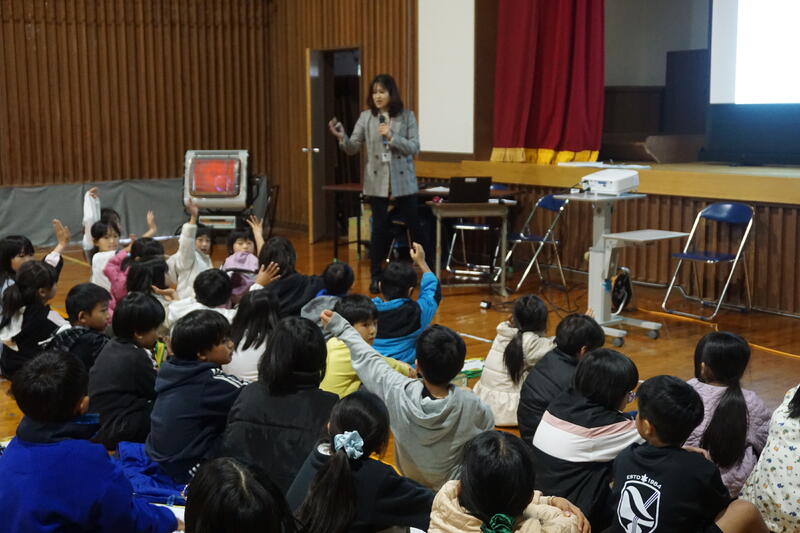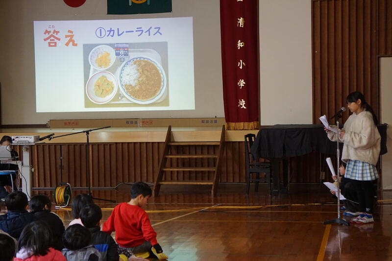 給食の始まりについての説明や、給食クイズで盛り上がりました。