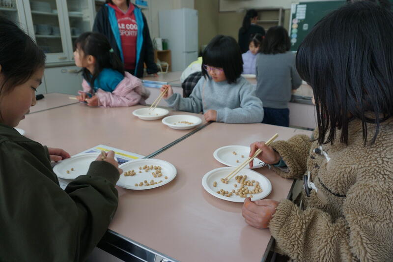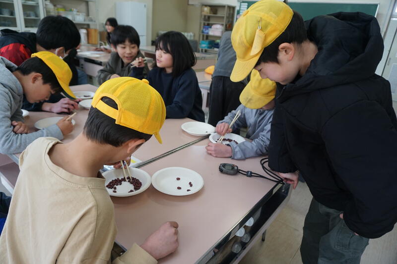 2月26日(水)と27日(木)の昼休み時間、家庭科室で、給食委員会による「豆つかみ大会」がありました。