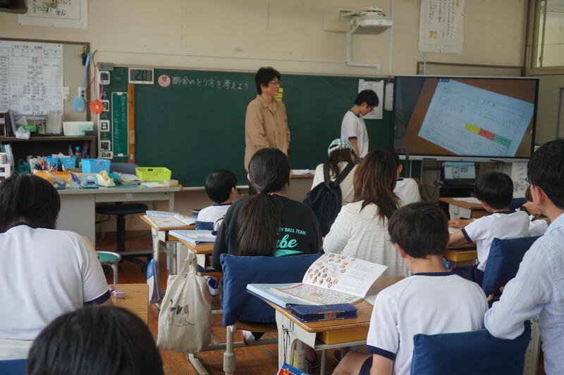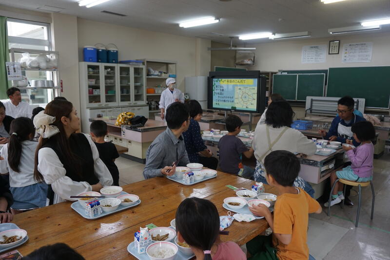 授業後は、給食試食会です。ちょうど、「ふるさとくまさんデー」だったので、みんなで栄養教諭作成の、地域を紹介する動画を視聴しました。