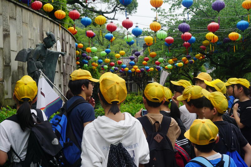 そよかぜパークまでバスで移動したあと、縦割り班ごとにウォークラリーです。各ポイントごとにいる先生方が出す問題に班で協力して答えながらすすみます。