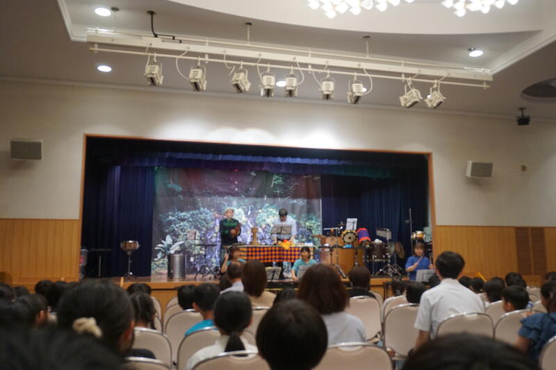 まず楽器の説明がありました。琴や尺八、太鼓の材料や音がでるしくみなど、子どもたちは驚きながらも真剣に聞いていました。次に実際の演奏では、和楽器特有の音色の迫力や優雅さに、子どもたちは引き込まれていたようです。