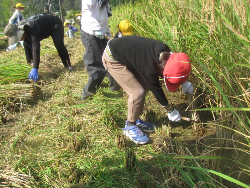 保護者の方より、鎌を使っての稲刈りの仕方を教えていただいた後、実際に自分たちで稲を刈りました。最初は、ぎこちなかった手つきも次第に素早く、要領よく刈れるようになってきました。