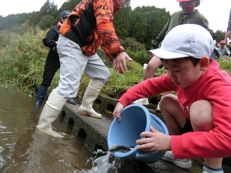 ヤマメの稚魚を大事そうに川に放流しながら