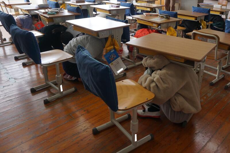 地震が発生したという訓練放送をきくと、子どもたちは机の下にもぐり、机の脚をしっかりと持って、体を守っていました。