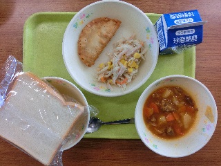 食パン、ロシア風スープ、ごぼうサラダ、ピロシキ、牛乳