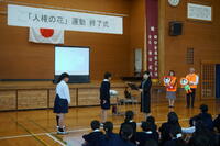 八代市人権政策課、法務局や人権擁護委員の方々8名にお越しいただきました。本校を代表して6年生が出席し、感謝状・記念品(人KENまもる君・あゆみちゃんのマスコット人形)を受け取りました。