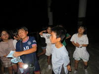 1日目の夜はナイトゲームをしました。1班6~7人の12班に分かれて、青少年の家の近くの道を歩きました。怖がって固まって歩くグループもあれば、ばらばらに歩くグループ、空元気で歌いながら歩くグループなど、反応は様々でしたが、とても楽しんでいる様子でした。