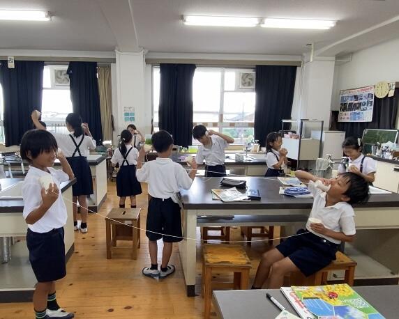 実験では「風呂の残り湯」「みそ汁」「洗濯排水」「米のとぎ汁」の中で、川の水にとって悪い影響を及ぼすのはどれか調べました。子どもたちの多くは、洗濯排水や風呂の残り湯と予想していましたが実験してみると、味噌汁や米のとぎ汁だということが分かり、驚いていました。