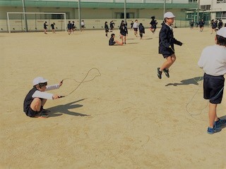 今日はよい天気だったので、昼休みには運動場で大縄跳びをする様子が見られました。