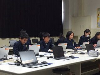 音楽の授業ではタブレットPCを活用し、口の開け方を撮影しました。