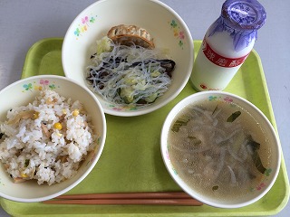 今日の給食はわかめご飯や魚などが出ました。