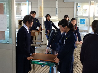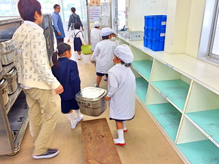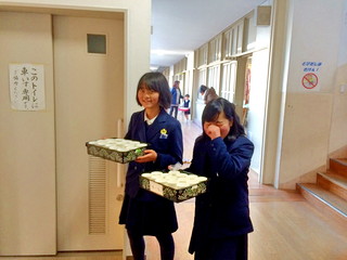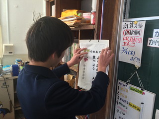 以前の委員から教えてもらいながら給食準備や放送をする姿が見られました