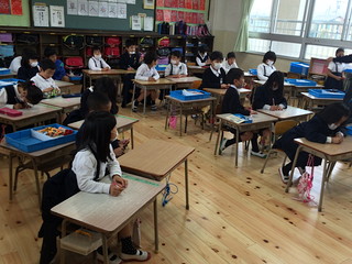 今日の給食時間の様子です。みんなで座席を引いています。