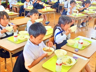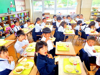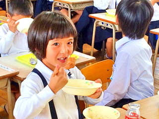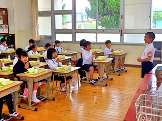一年生は給食の準備をしっかりできます。手を合わせていただきます。