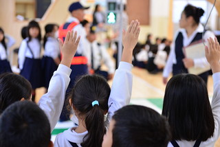 教室内に信号を設置して、横断します。手がしっかり挙がっていますね!