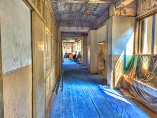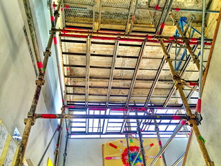 2階も廊下天井をはぐ作業は終わり、足場なども組まれています