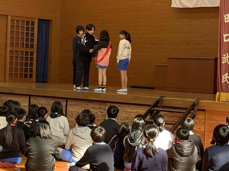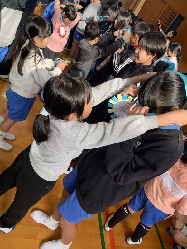 学校のリーダーであった6年生から、次のリーダーとなる5年生へたすきを渡しました。