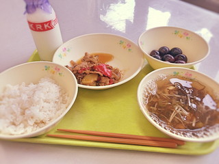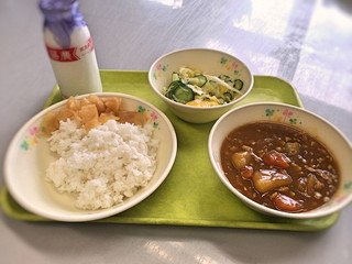 今日の給食は野菜炒めやもずくスープでした。子どもたちは「いないいないばあ」の方のお話を聞きながら、楽しそうに食べていました。