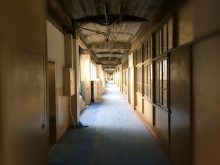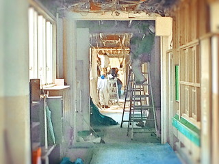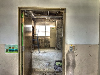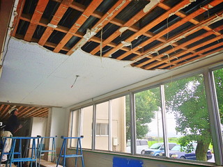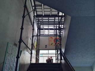2階も廊下天井をはぐ作業は終わり、足場なども組まれています
