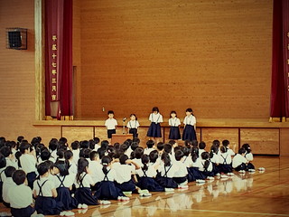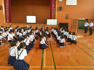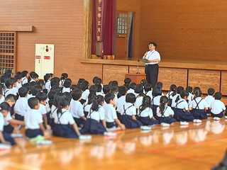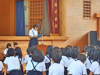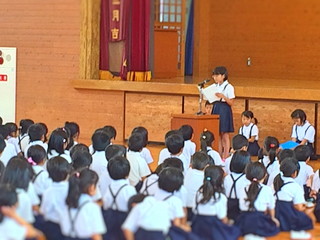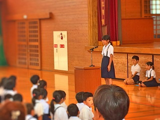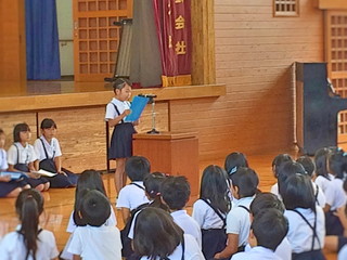 日頃からあいさつを頑張ったことや、社会の勉強を頑張り、運動会や自転車大会など行事の思い出についての発表でした。