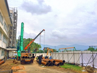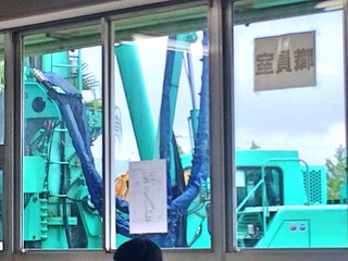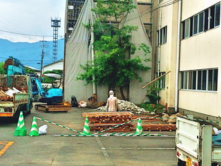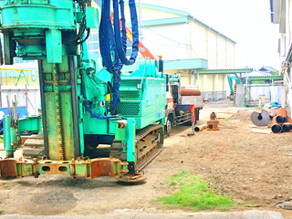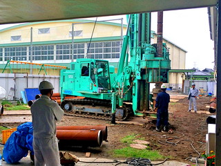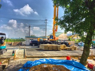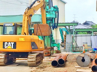 今日の工事の様子です、太い鉄の円柱を地面に埋め込んでいるところです。