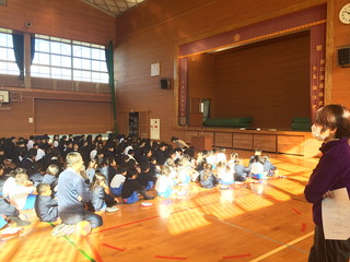 先生が持ってきた本の読み聞かせを熱心に聞いている姿が見られます。