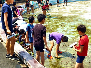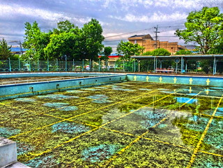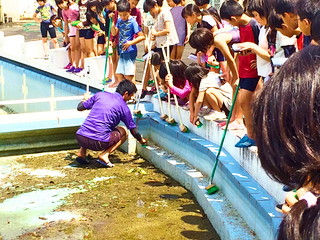 今日はプール掃除です。朝のプールの様子です、泥がたまっています。