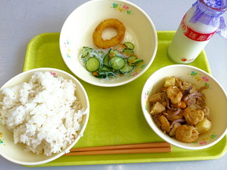 今日の給食は鳥のマスタード焼きでした。給食の先生に聞いたところ、初めてのメニューだったそうです。