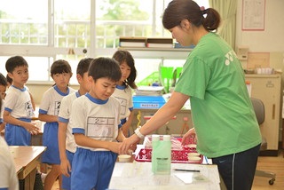 今日はプクプクタイムです。フッ化物洗口の準備をしています。