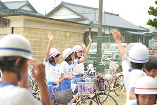 今日は水難避難訓練をしました。学校近くの夜狩川に氾濫がある想定で集団下校を行いました。