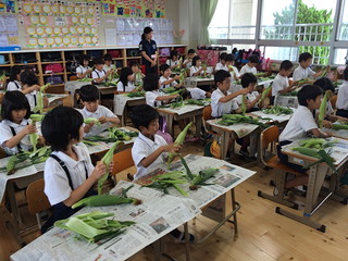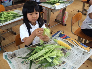 このトウモロコシは、昨日1,2年生が皮をむいたものですよ!