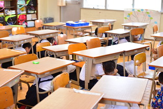 今日は地震の避難訓練がありました。放送があり、机の下で身を守っているところです。