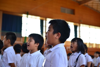 校歌を全員で歌っています。大きく口を開いて歌っています。