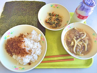 今日の給食はセルフおにぎりと肉うどんでした!おいしかったですね!