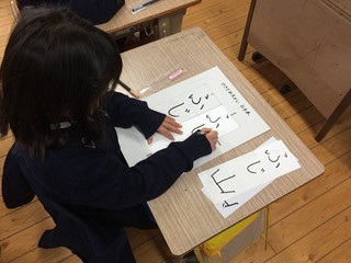 お手本をよく見ながら一生懸命書いていますね。