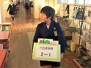 図書委員会は、それぞれの教室に本を運んでいます。