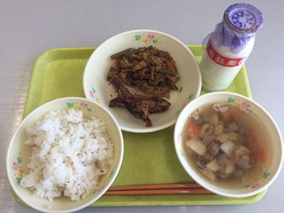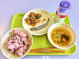 今日の給食は秋田のメニューだそうです。ハタハタやふきのきんぴらなど珍しい食べ物でした。