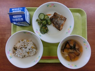 高菜ごはん、五目汁、きゅうりのゆかり和え、ホキのサラ玉ソース焼き、牛乳